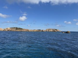 Am 22.07.25 sind wir zu einem Ankerplatz in der Bucht vor dem kleinen Ort Portixeddu gefahren, eine Fahrstrecke von 32 Sm südlicher. Auf der 5 1/2 stündigen Fahrt hatten wir einen 12 – 15 Knoten Wind aus NNW aber auch ein entsprechender Wellengang. Als wir die Bucht erreichten waren wir zwar vor dem Wind geschützt jedoch die Dünung sorgte für viel Bewegung des Schiffes, welche bis zum nächsten Morgen anhielt. Anstrengend! Danach wurde es ruhiger. Mit dem Dingi sind wir an Land zum Strand und haben in der Strandbar ein Bier bzw. Wein genossen.