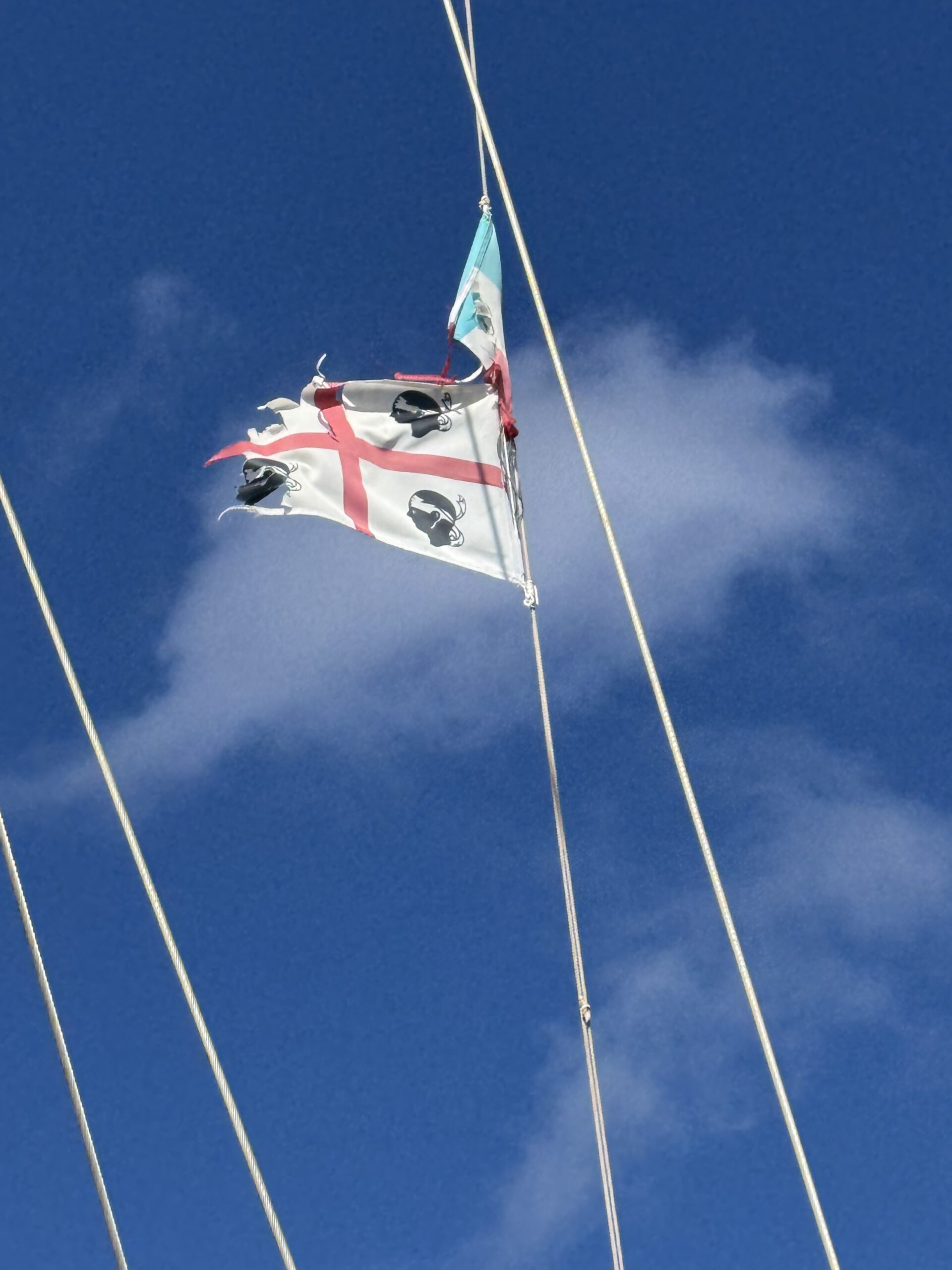 Törn rund um Sardinienman sieht es an den Fahnen, Italien und Sardinien, beim Abnehmen haben sie sich fast zu Staub aufgelöst. Wir haben Sardinien fertig!!!