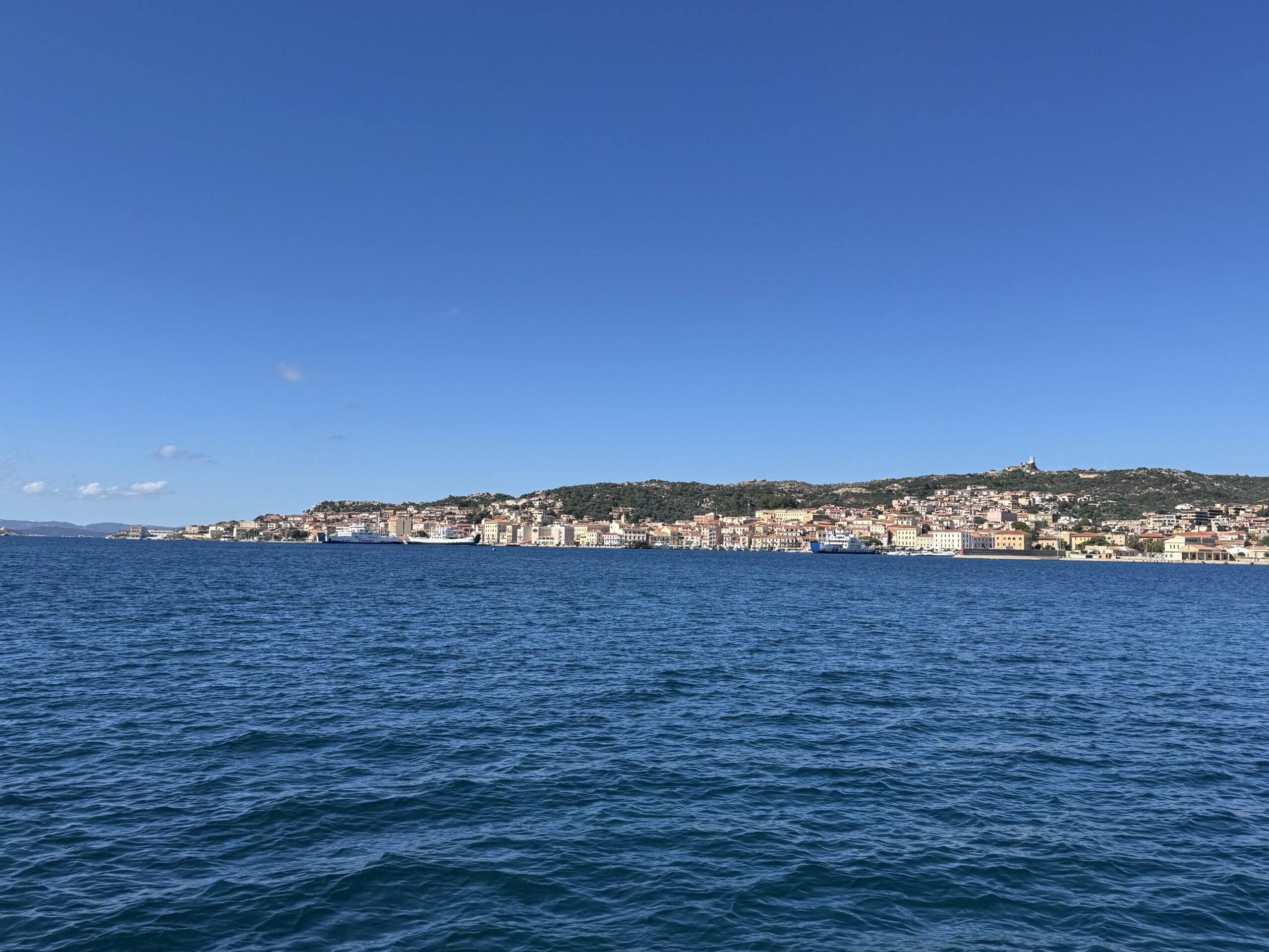 die Insel Caprera in Sicht, Nachbarinsel von La MaddalenaLa Maddalena, Name der Insel sowohl als auch des Ortes