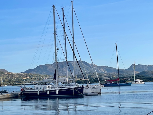 Am nächsten Tag besuchte uns ein Turnfreund von Guus, Tissy. Er hatte mit seinem Rad die Insel in einer Woche umrundet, und dabei rd. 1.000 km zurückgelegt …. alle Achtung. Wir hatten uns 2 Jahre nicht mehr gesehen, sodass es vieles zu erzählen gab. Er hat an Bord übernachtet und gegen Abend des nächsten Tages ist er zurück nach Olbia geradelt, weil er am Tag darauf frühmorgens nach Hause flog. Schöne Begegnung! Tissy ist von Beruf Art Director und hatte dementsprechendes Profimaterial, wie Drohne, GoPro, Fotoapparat etc. dabei. Er hat sich die Zeit genommen und erklärt wie und wann er das Equipment benutzt. Die Drohne hat er auch im Hafen fliegen lassen, sodass wir unsere GusAnne von oben fotografiert bekamen.