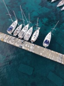 Blick von oben auf die MarinaDrohnen“Blick“. GusAnne, 2.Boot von rechts, nicht direkt auf den ersten Blick zu erkennen, da alle eine weißes Oberdeck habenMittagslunch mit Tissyund wieder Abschied!